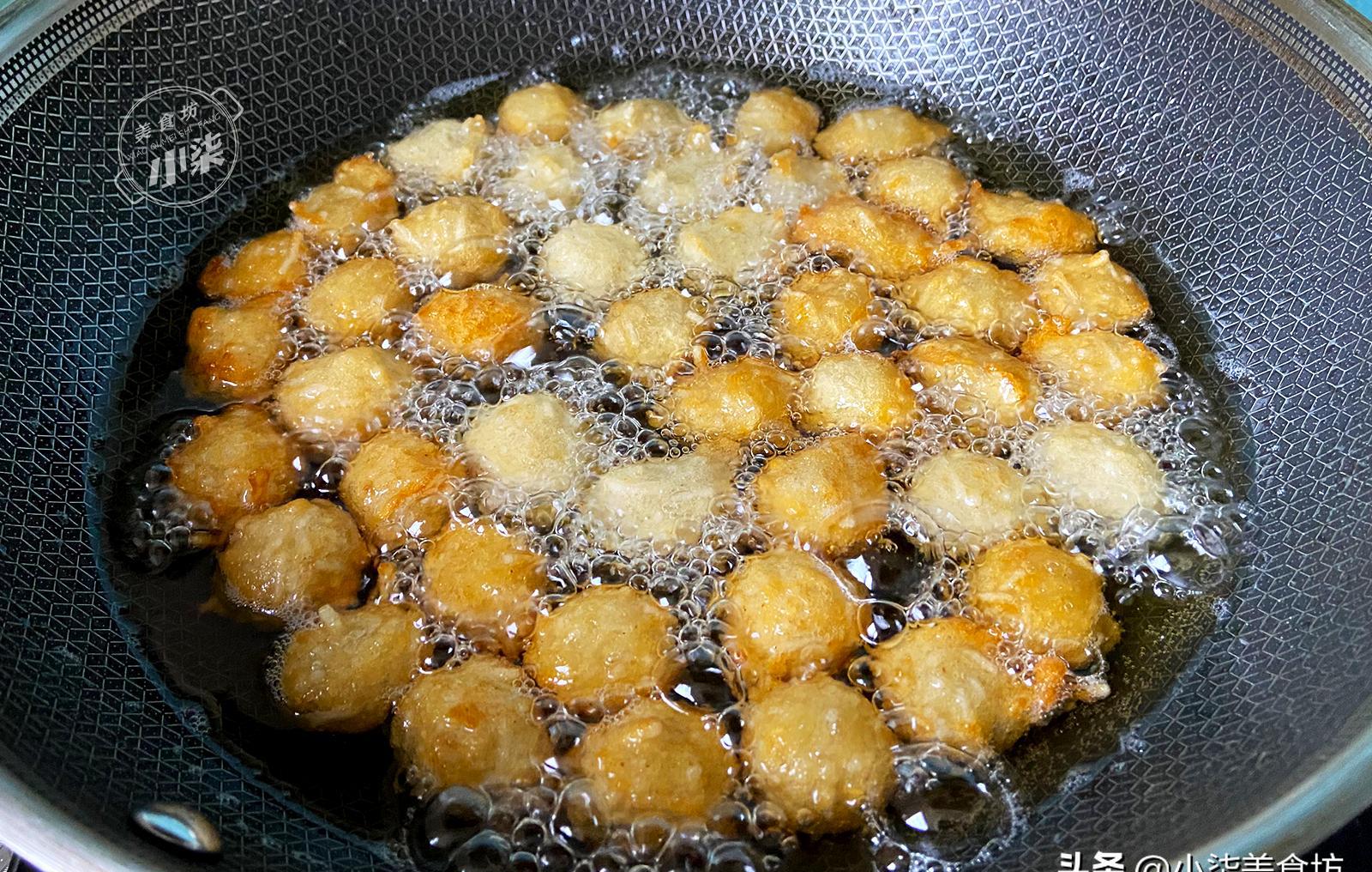 9。用勺子将挤压球sc到油底壳中。将油菜油或花生油加入锅中以炸炸,将油温度燃烧至60%的热量,然后将球一一将球放入油底壳中。