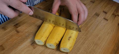 1。将香蕉切成头和尾巴,然后切开生长部分,然后将香蕉皮剥落。用皮肤切割的香蕉不容易损伤。