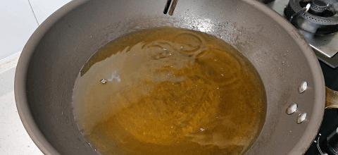 4。在锅中加入适当数量的植物油,并将油温度燃烧至热量的40%。目前,放筷子会变成一个小气泡,然后变成中火。