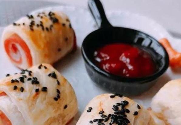 逐步:用轻微的解冻切蛋糕,将其切成四片。每个培根切成两半。用鸡蛋液体刷,撒上芝麻。预热190度,烘烤约20分钟,直到表面变成金黄色。您也可以吃番茄酱,这绝对是孩子的最爱。怎么样,很简单?尝试在家做!