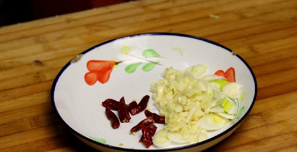 第二:将绿色的洋葱切成薄片,然后准备一些大蒜,将其切成末端,准备一些干辣椒,将三个鸡蛋放入碗中,然后将其散布。