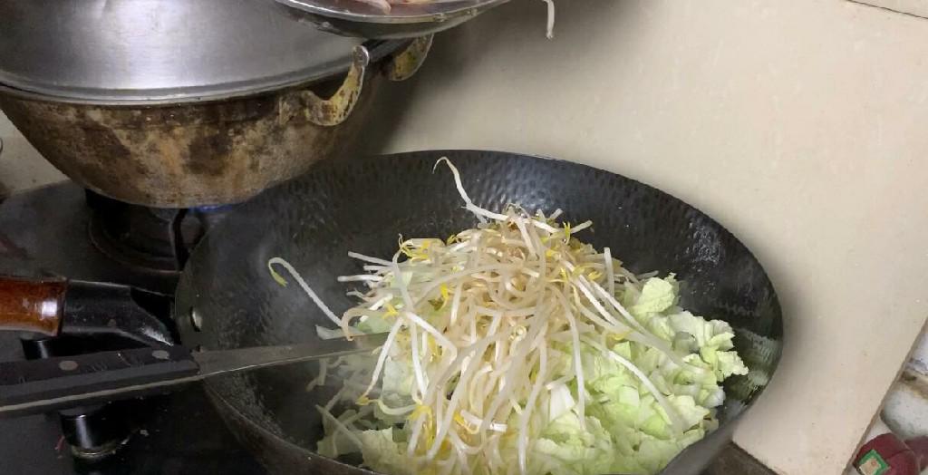 首先:首先清洁准备好的成分,清洁豆芽,将其放入篮子里以控制它,然后将卷心菜叶切成碎片。