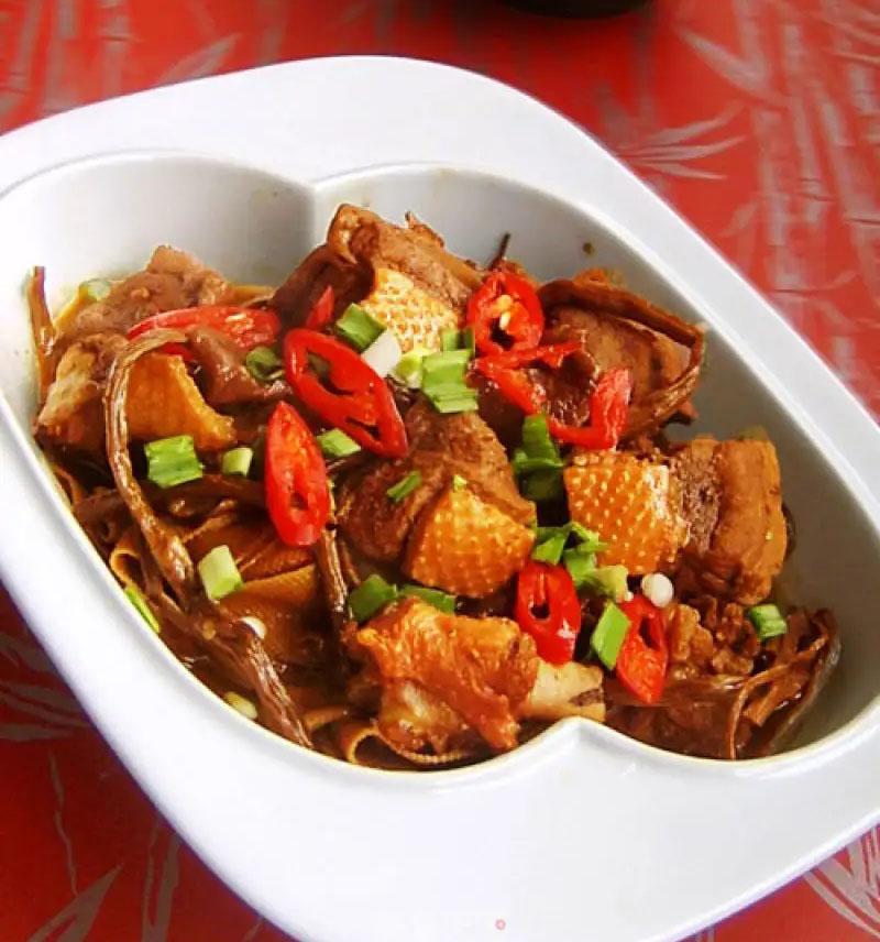 准备成分:50克干茶树蘑菇,500克鸭肉,红辣椒,洋葱,姜,大蒜,八角芳烃,胡椒粉,盐,鸡肉,鸡肉精华,烹饪葡萄酒,淡酱油和白糖。