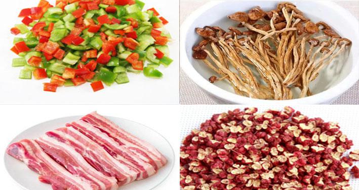 1。切断茶树蘑菇的根,浸泡并洗净。将葱切成葱,将姜切成碎片,切成大蒜,然后将红辣椒切成碎片。