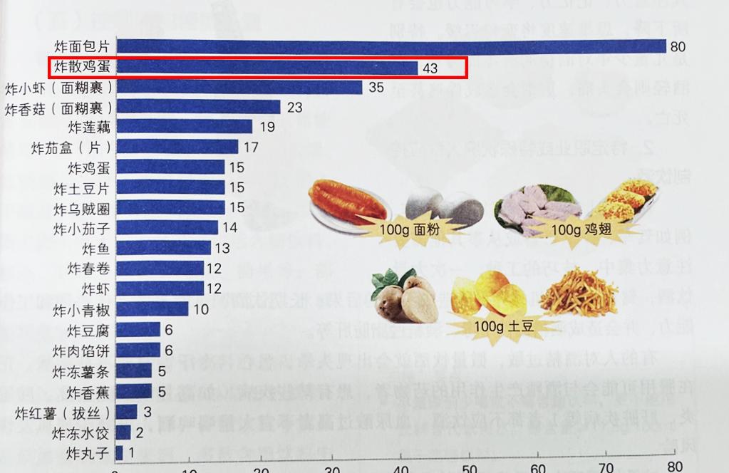 “中国居民饮食指南”编译了普通炸食品的油吸收率,油炸鸡蛋远处,油的吸收率高达43%。