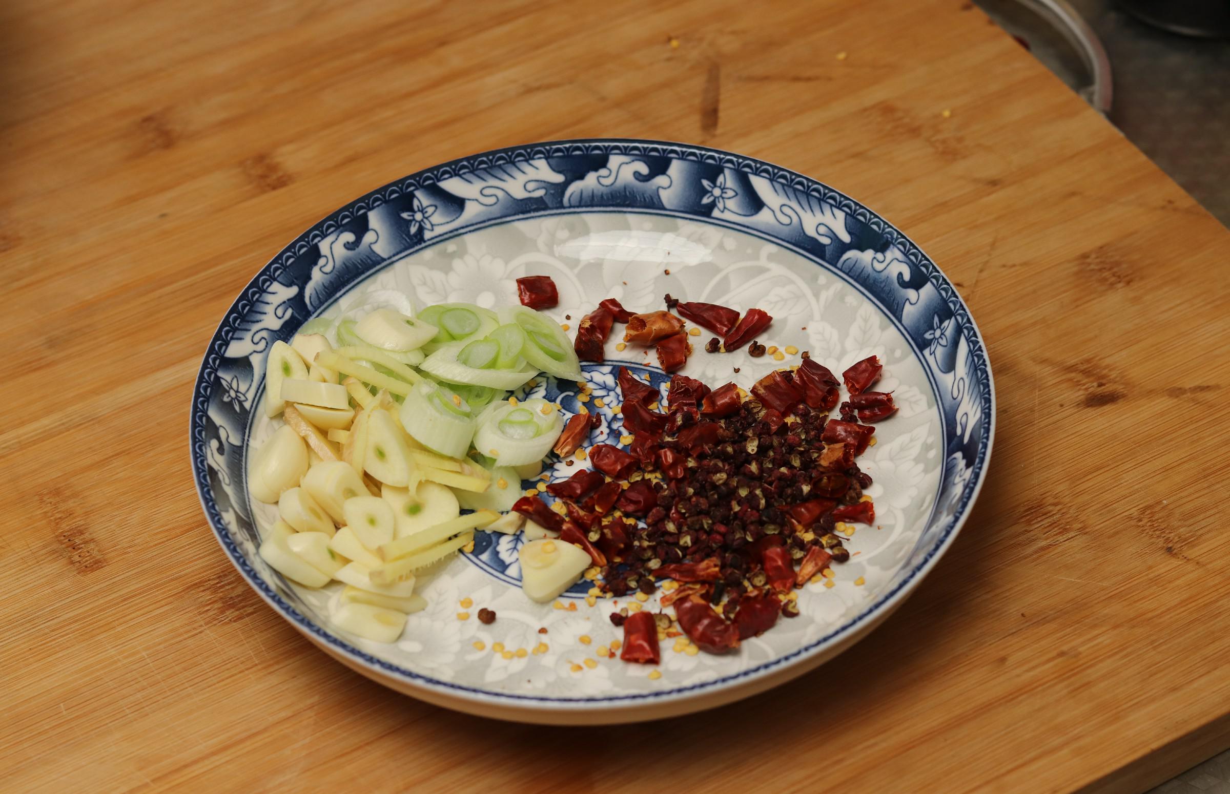 第二:准备2个毛肚皮,将五花肉切成薄片,然后将其切成碎片,最后将其切成碎肉。然后切一些绿色的洋葱,生姜,大蒜,切成绿色的洋葱,切成生姜,切成大蒜以供以后使用。准备更多干燥的辣椒,将干辣椒切成碎片,然后准备少量辣椒供以后使用。