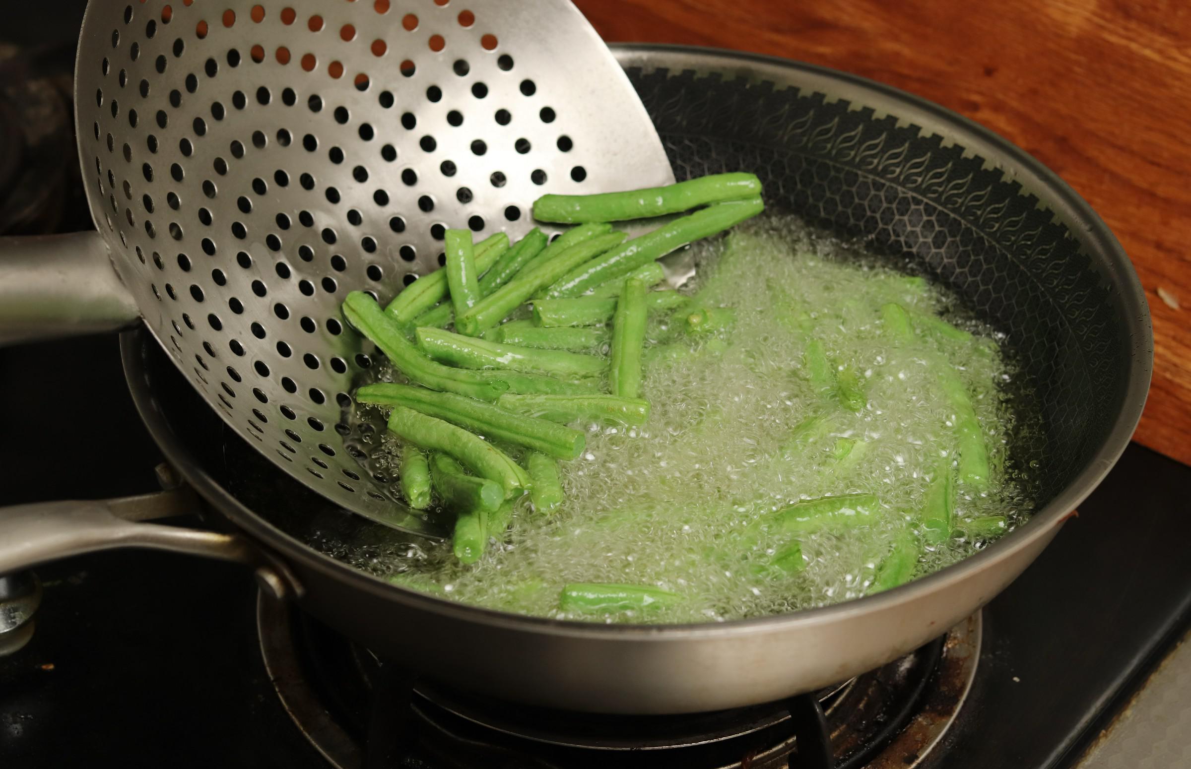 首先:准备一些绿豆,从绿豆的头部和尾巴上捏住,将青豆放入干净的水中,清洁,洗涤后将其清除,控制水,然后将绿豆放在切碎的板上,稍微干燥,然后用双手将青豆切成大约5厘米的长片。