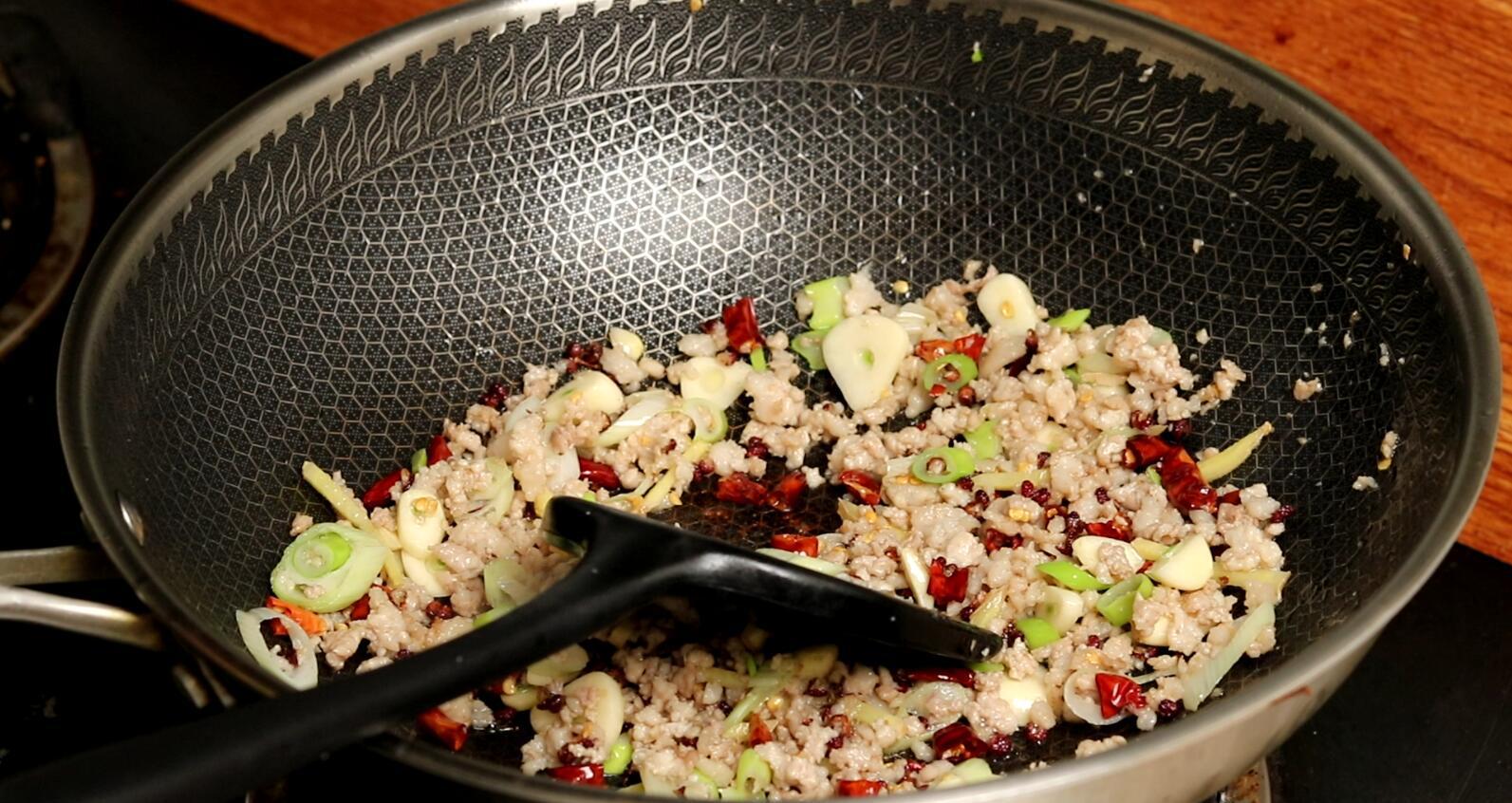 5)将切碎的肉炸至干燥和香。干炸绿豆使香气更香