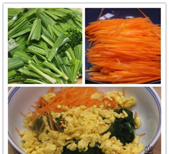 5。使用相同的方法将准备好的胡萝卜涂在水中并切断原始度,然后用漏勺将水排干,然后将其添加到韭菜中以备后用。