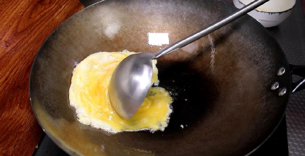 4。炸鸡蛋:将两个鸡蛋打入碗中,打鸡蛋,放在一边,将油倒入锅中,然后将鸡蛋液体倒入热油中。首先炸鸡蛋,然后将炸鸡供以后使用