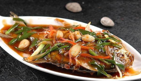 一个新鲜的pomfret,适当数量的绿洋葱,姜,大蒜,一点干辣椒,一汤匙面条酱,少量糖,一小茶匙烹饪葡萄酒,少许醋,少许盐和花生油。