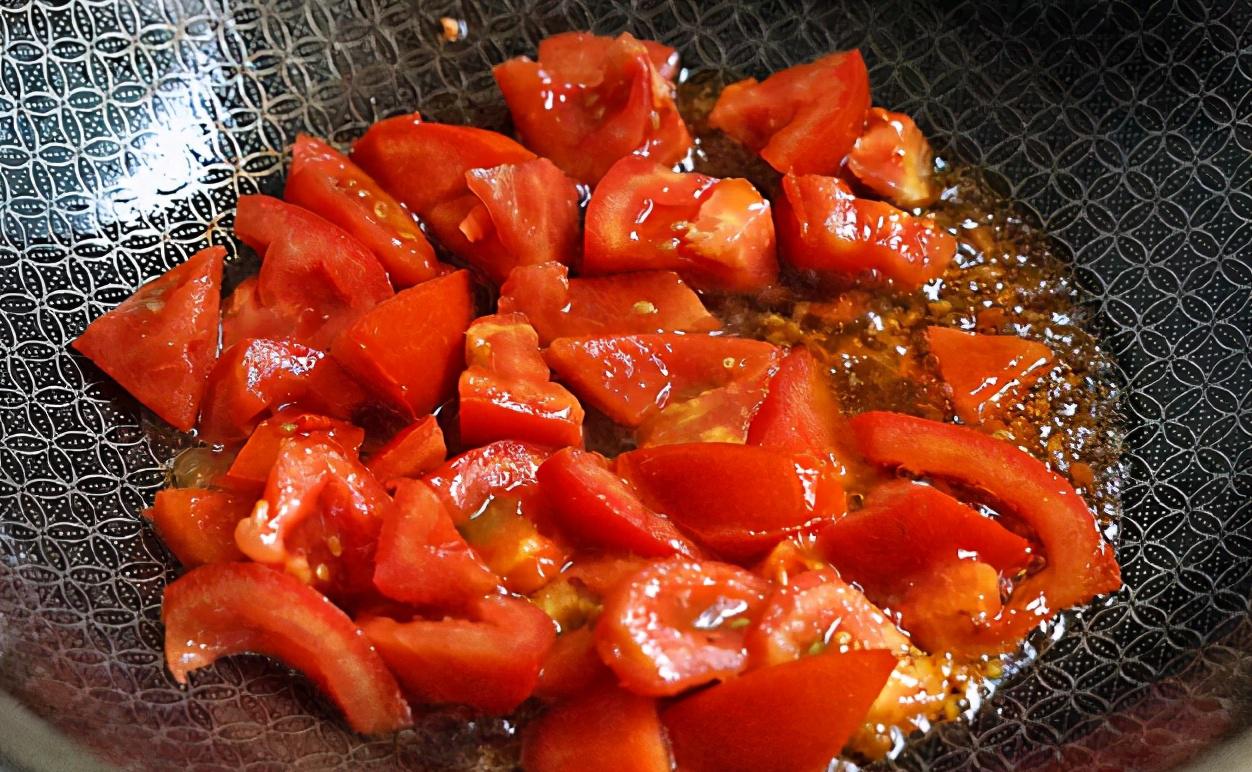 预热锅,加入食用油并加热至50%热,将切割的番茄块倒入锅中,然后快速炒。