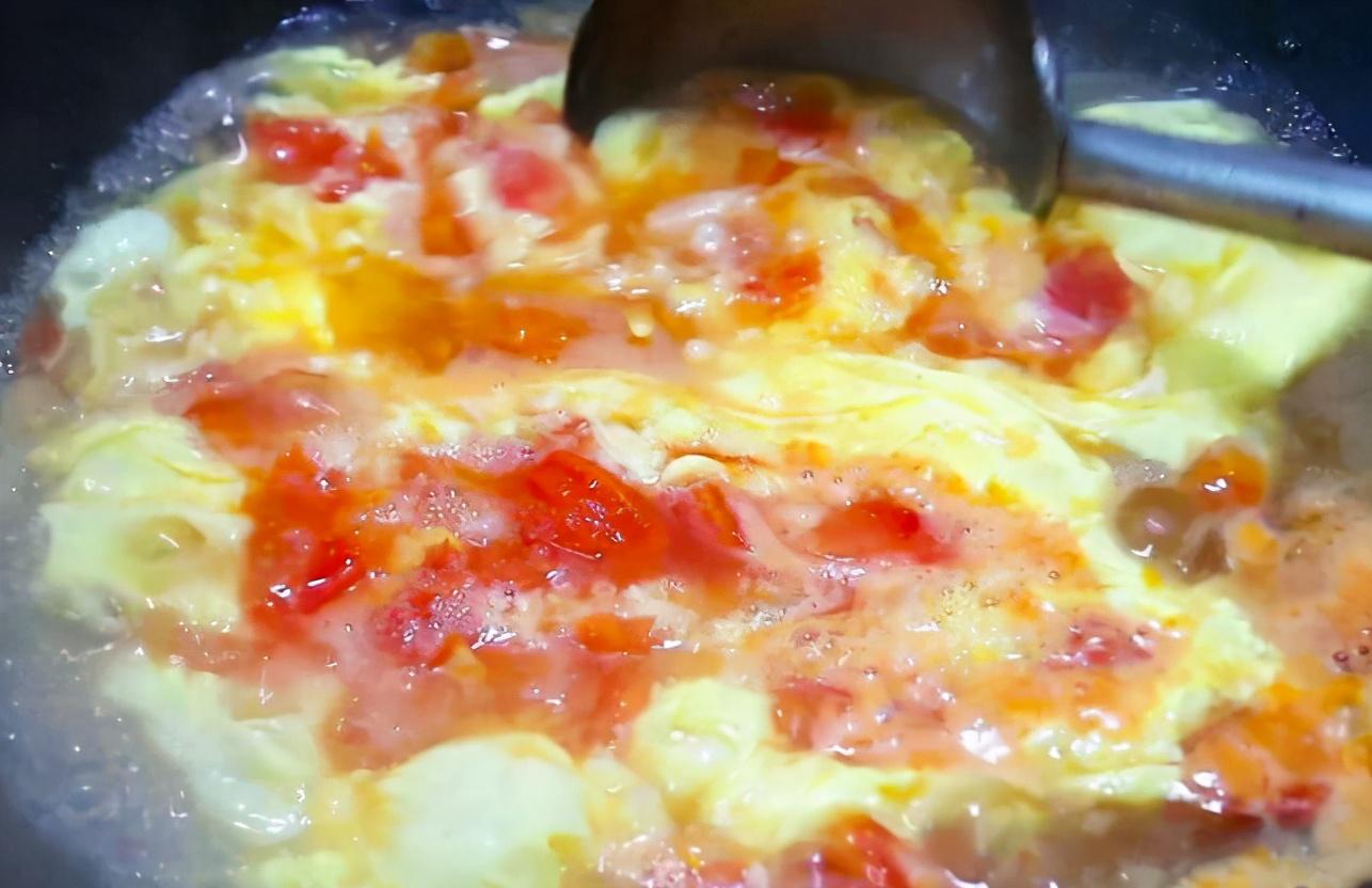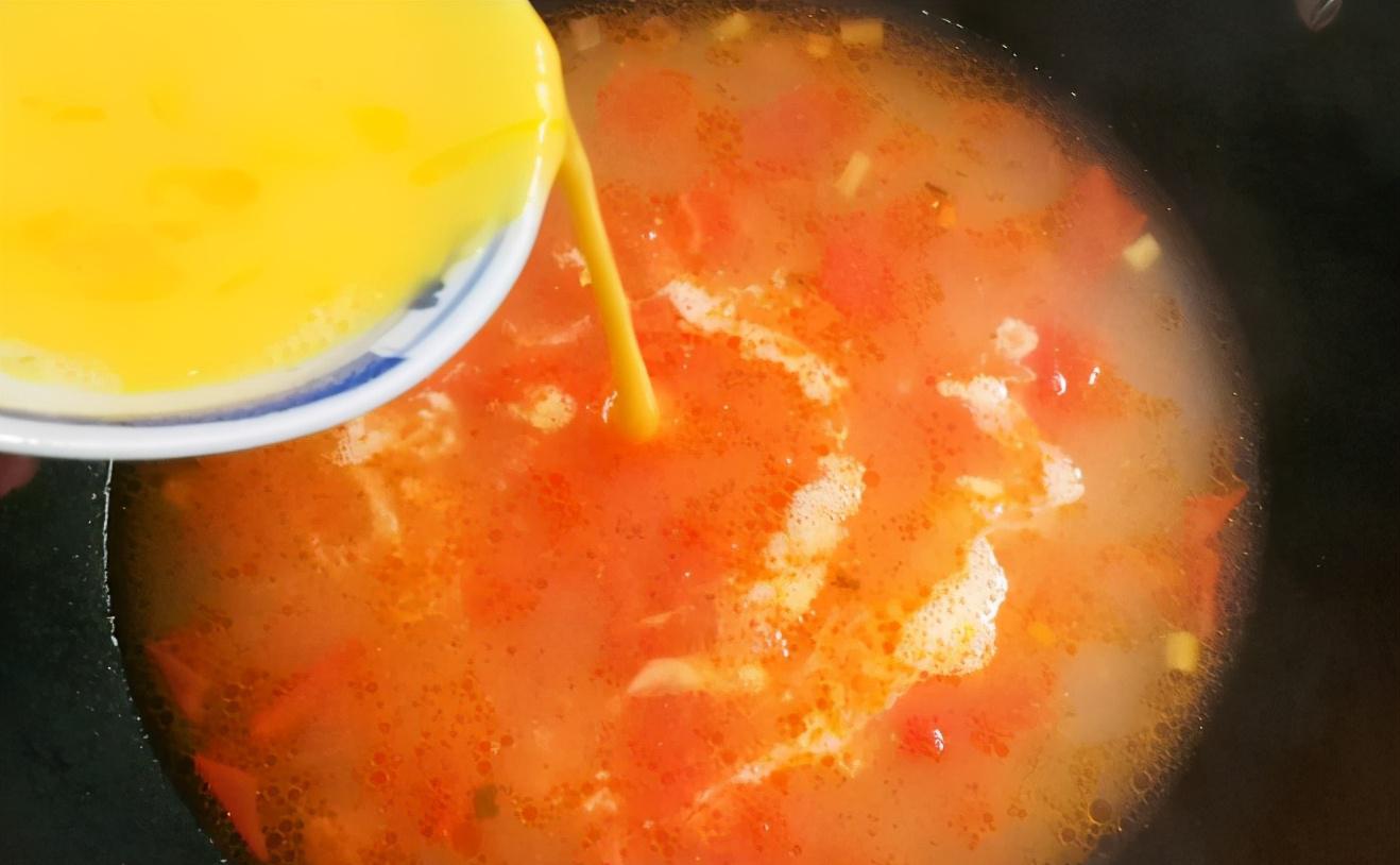 制作番茄和鸡蛋汤时,倒鸡蛋液体有一些专业。教你如何拿3分。鸡蛋花很漂亮,味道很光滑!