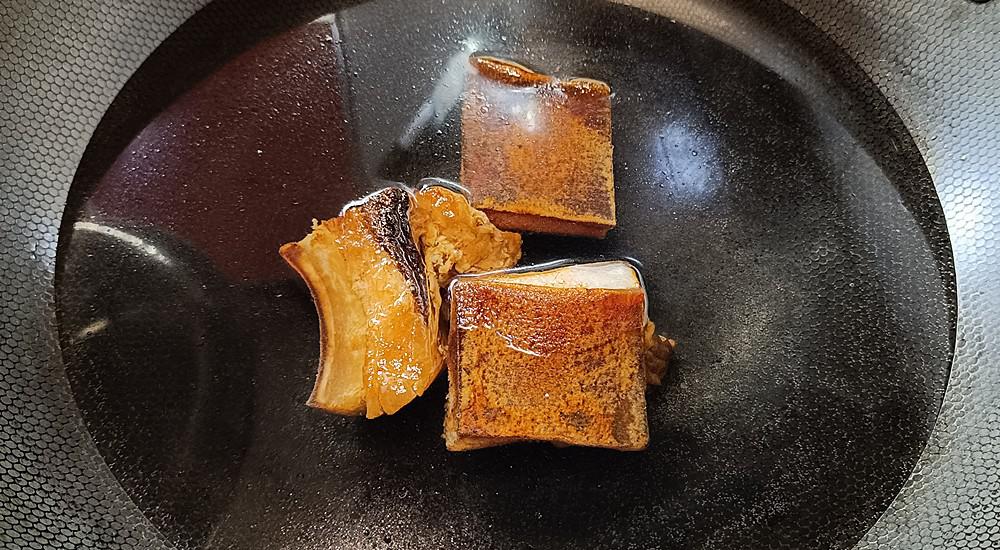[步骤5]:在锅中加入一点油,然后加热,倒入培根,用高火搅拌,搅拌培根的油脂,加入姜和大蒜以搅拌以散发出香气,加入1汤匙的烹饪酒,用高火搅拌以散发出葡萄酒的香气。