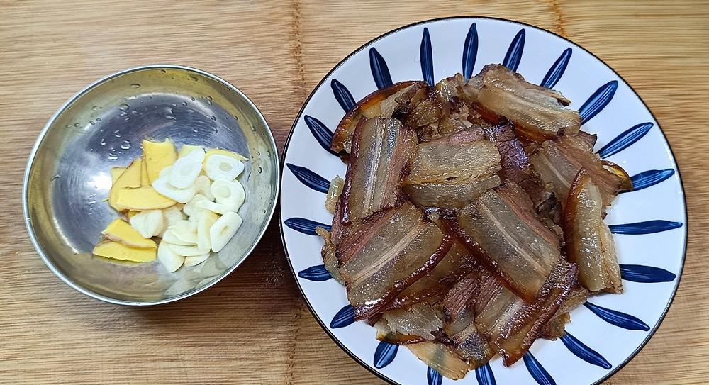 [步骤2]:煮培根,让它冷却,然后更换刀将其切成薄片,然后将其放在盘子上。将生姜和大蒜切成片,然后将其放在盘子上供以后使用。