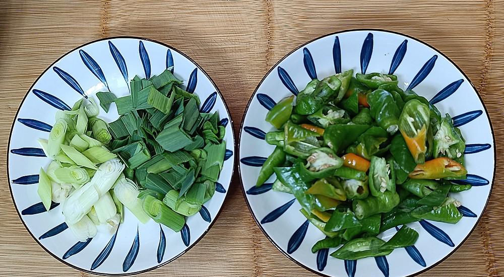 【主要成分】:1块培根,4-5辣椒,2个绿色大蒜芽