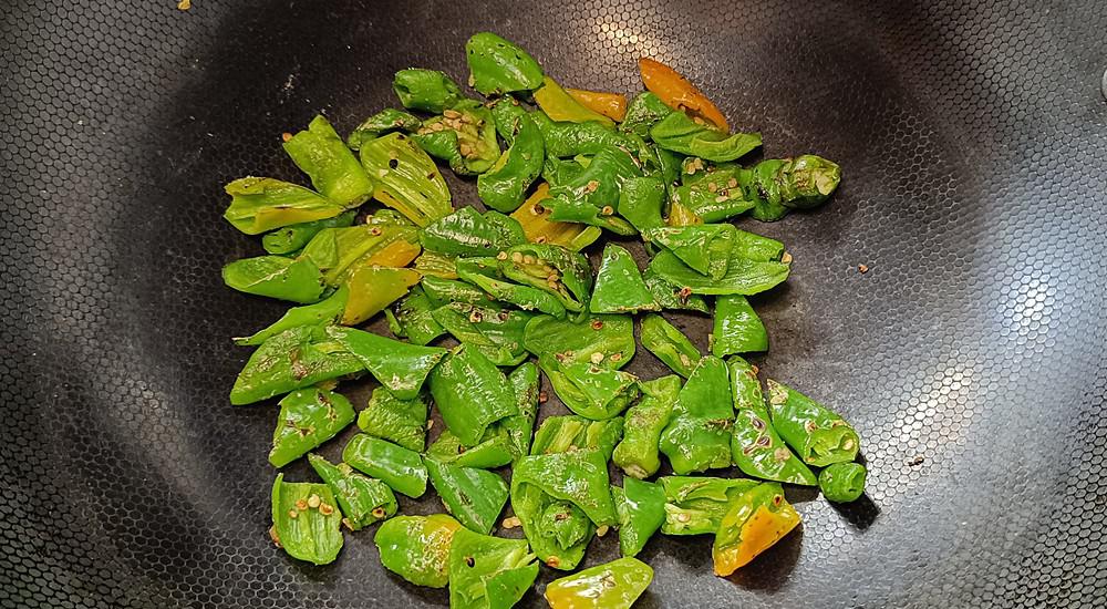[步骤4]:清洁锅并加热,将辣椒放入锅中,搅拌辣椒,加入少许盐,均匀搅拌,然后搅拌直至老虎皮肤涂上颜色,然后从锅中脱下来供以后使用。