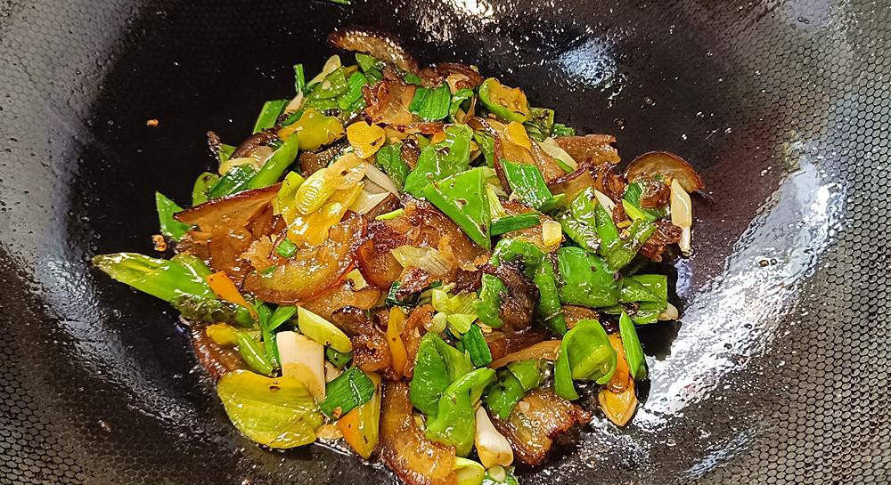 (3)搅拌锅是这道菜的关键步骤。您必须首先搅拌辣椒,搅拌老虎的肤色,然后搅拌培根。