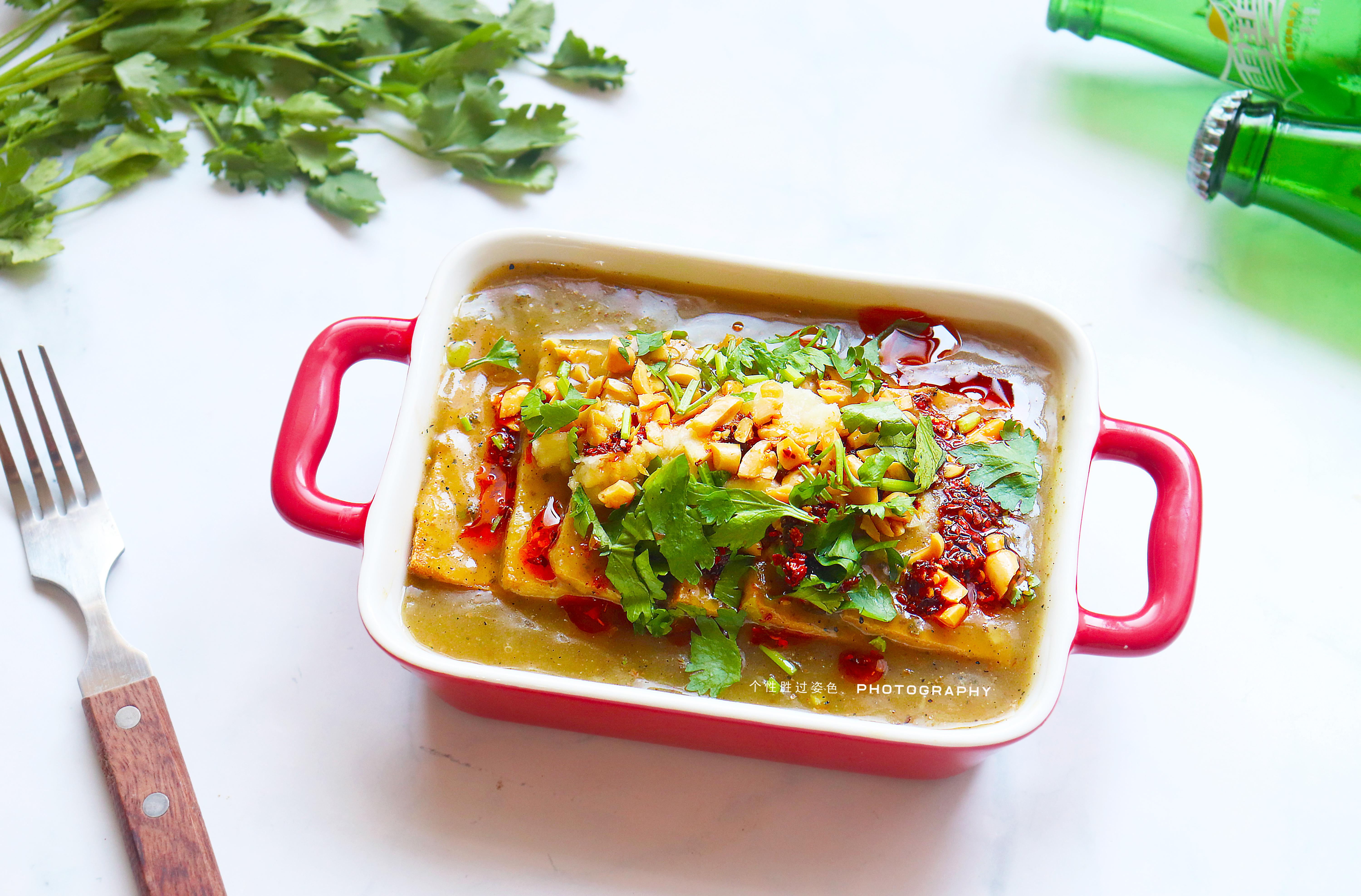 5。将豆腐放在碗中,倒汤,撒上切碎的花生,大蒜,香菜和辣椒油