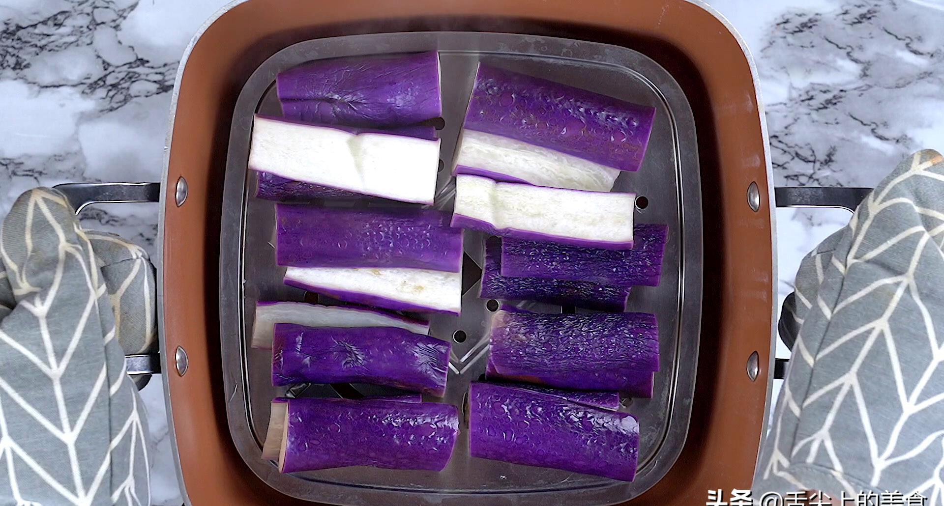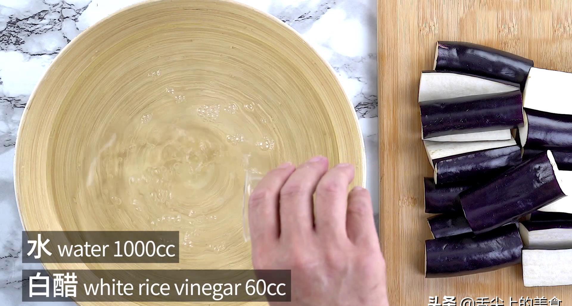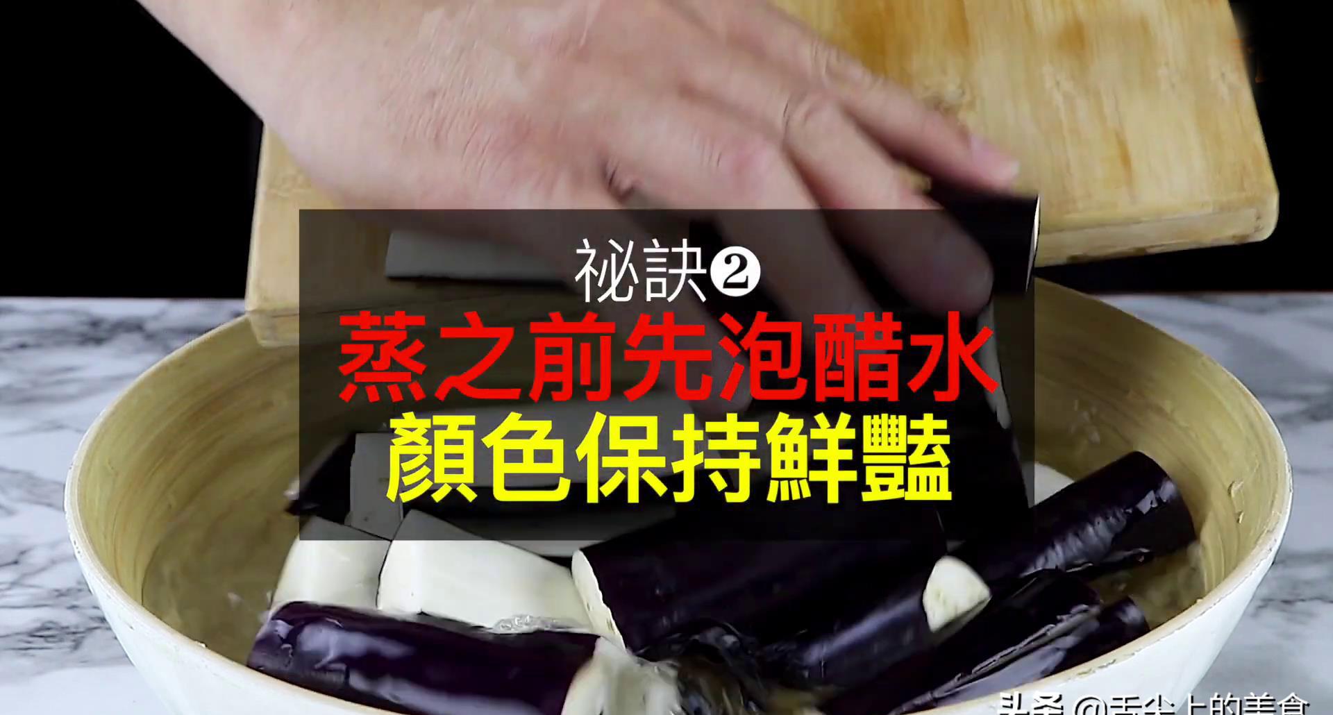 在将茄子蒸到锅中之前,我们应该将茄子浸入白醋水中,以便在蒸茄子后保持颜色明亮。