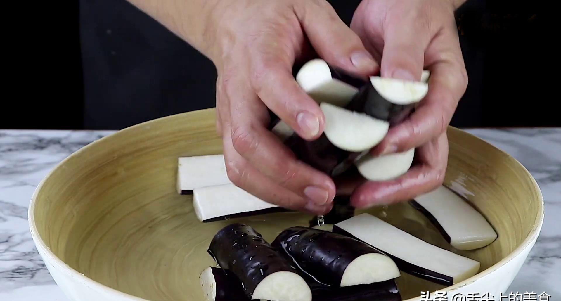 步骤2:洗净茄子,将其切成碎片,将其切成大片,将其切成两半,将其倒入醋水中,将茄子浸入约1分钟内,然后将其取出。