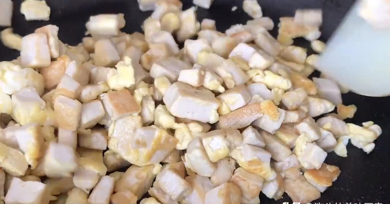 3。将豆腐切成薄片,然后将其切成条,最后将其切成小块切成小块,然后在其上加2个鸡蛋并搅拌以放在一边。