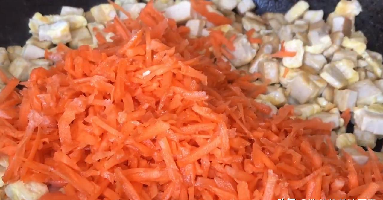 7.将水挤入卷心菜中,将其放入大锅中,加入胡萝卜,豆腐和切碎的绿色洋葱和生姜,然后加入少量虾皮,适当量的盐,适当量的淡酱油,适当量的牡蛎酱,适当量的胡椒粉,适当量的胡椒粉,适当量
