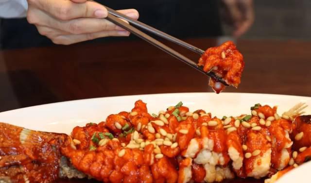 松鼠鲈鱼:炸海鲈,直到皮肤酥脆,颜色金色,淋上特殊的甜味酱汁。鱼肉酥脆又甜,略带酸和甜,这使得醒来肚子很美味。