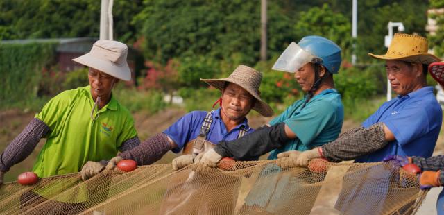在凌晨6点,在贝吉亚·迪多村(Baijiao Datuo Village),钓鱼池散布着一个大型网。随着海低音从钓鱼网滚出来,早晨的灯光闪闪发光的水滴发光,为黄金收获季节增添了鲜艳的色彩。