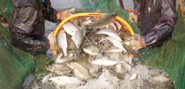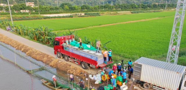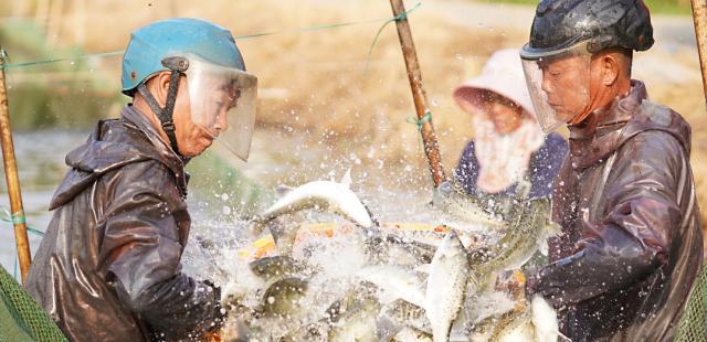 农民正忙于在池塘钓鱼,拉网,装载篮子,上岸,称重...看到鱼篮被装进卡车,我忍不住感到高兴。