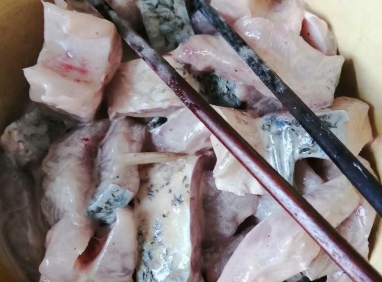 步骤2:洗鱼,用干毛巾擦干(或将其放在切碎板上时,它会很滑)。切掉鳍,切开鱼头,将鱼平放开,用一只手握住鱼身,另一只手握住刀,将鱼骨水平压在鱼体的肉片下。另一面也以相同的方式拍摄。将鱼肉和骨骼切成碎片。