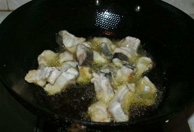步骤5:打开热量并向锅中加油。如果油的量略高,则将鱼放入锅中,然后将其炸掉,然后将其取出。