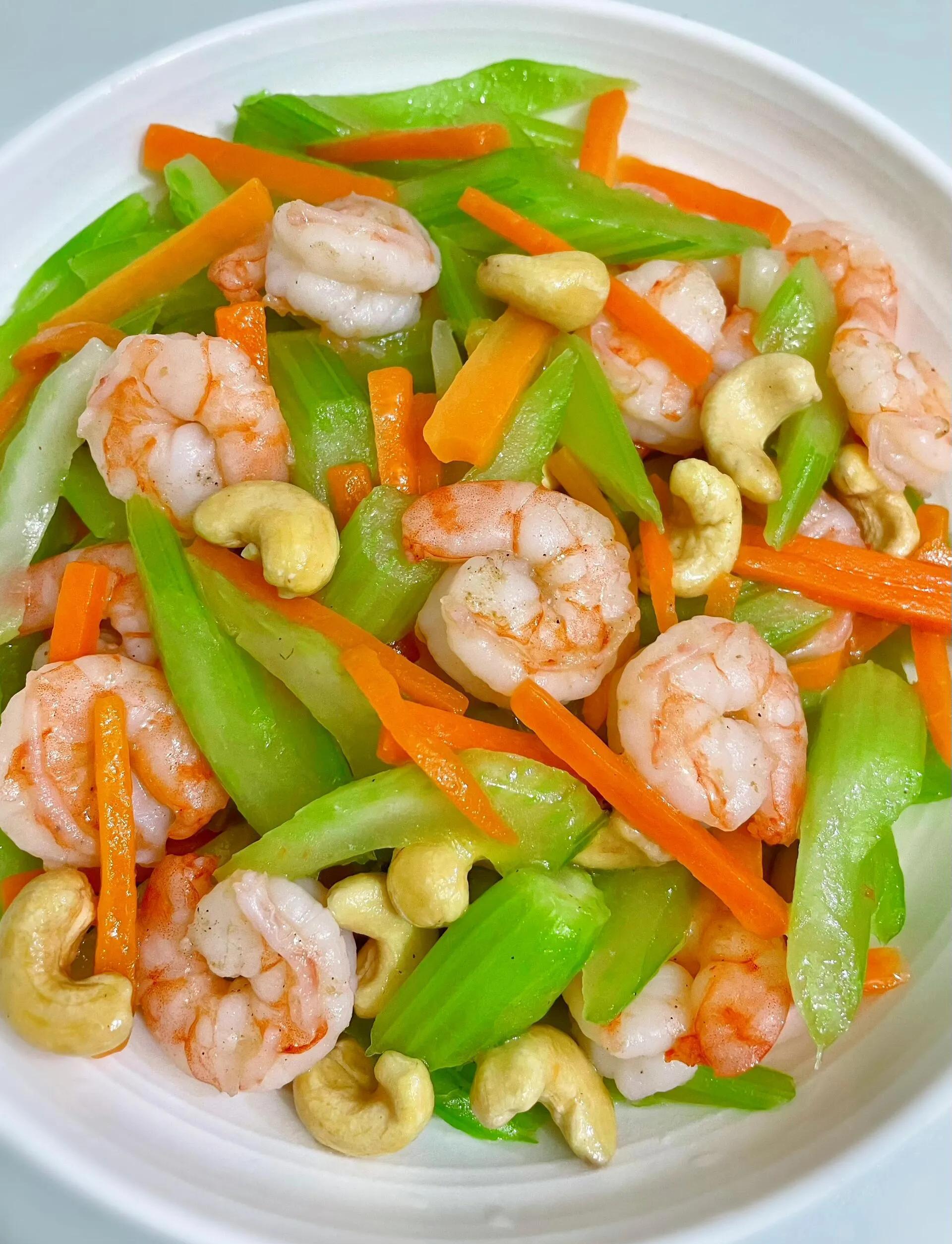 2。加热锅并冷却油,搅拌虾,直到它们改变颜色并食用。将芬芳的芹菜和胡萝卜炒在原始锅中,倒入虾和酱汁中,最后加入腰果并迅速炒。
