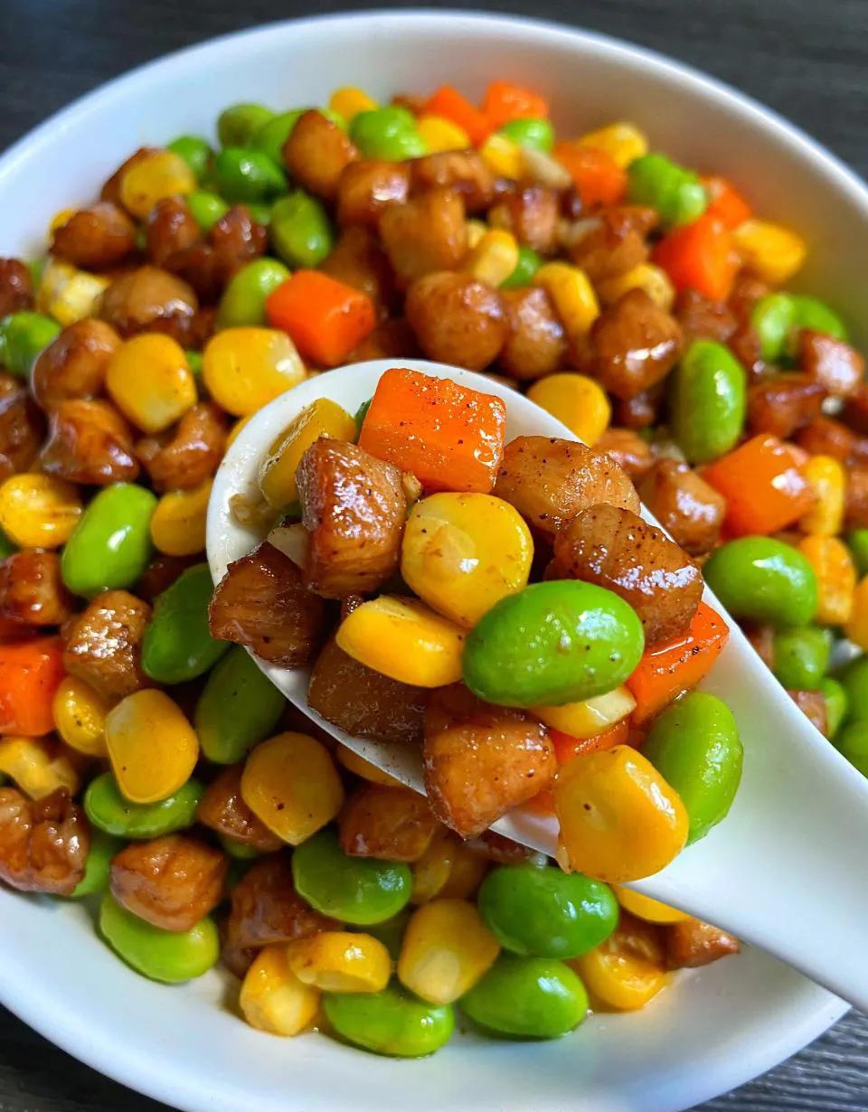 1。将鸡胸肉切成丁,加入1汤匙烹饪酒,一汤匙淡酱油,少许淀粉和盐,然后腌制15分钟;将胡萝卜和玉米切成仁,然后煮毛豆以供以后使用。