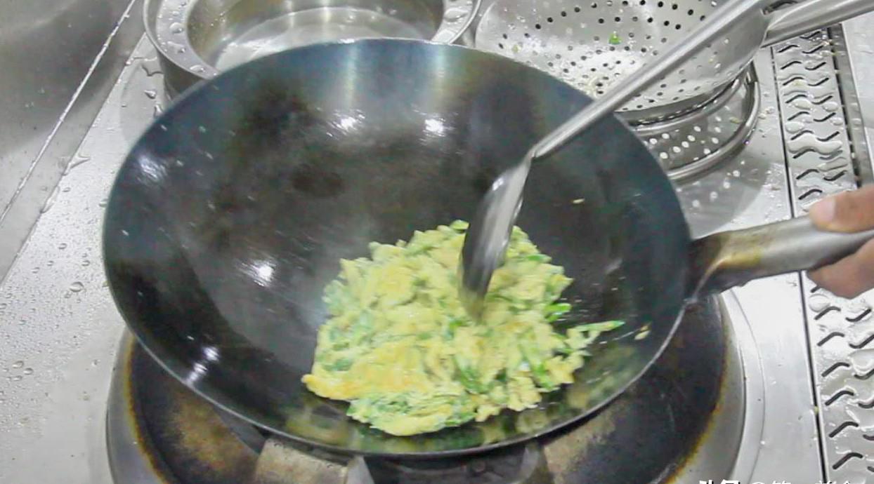 煎蛋一面凝固后,即可翻转煎另一面;经过如此反复翻炒数遍,鸡蛋便能均匀地附着在青椒之上,同时青椒亦不会出现半生不熟的情况。