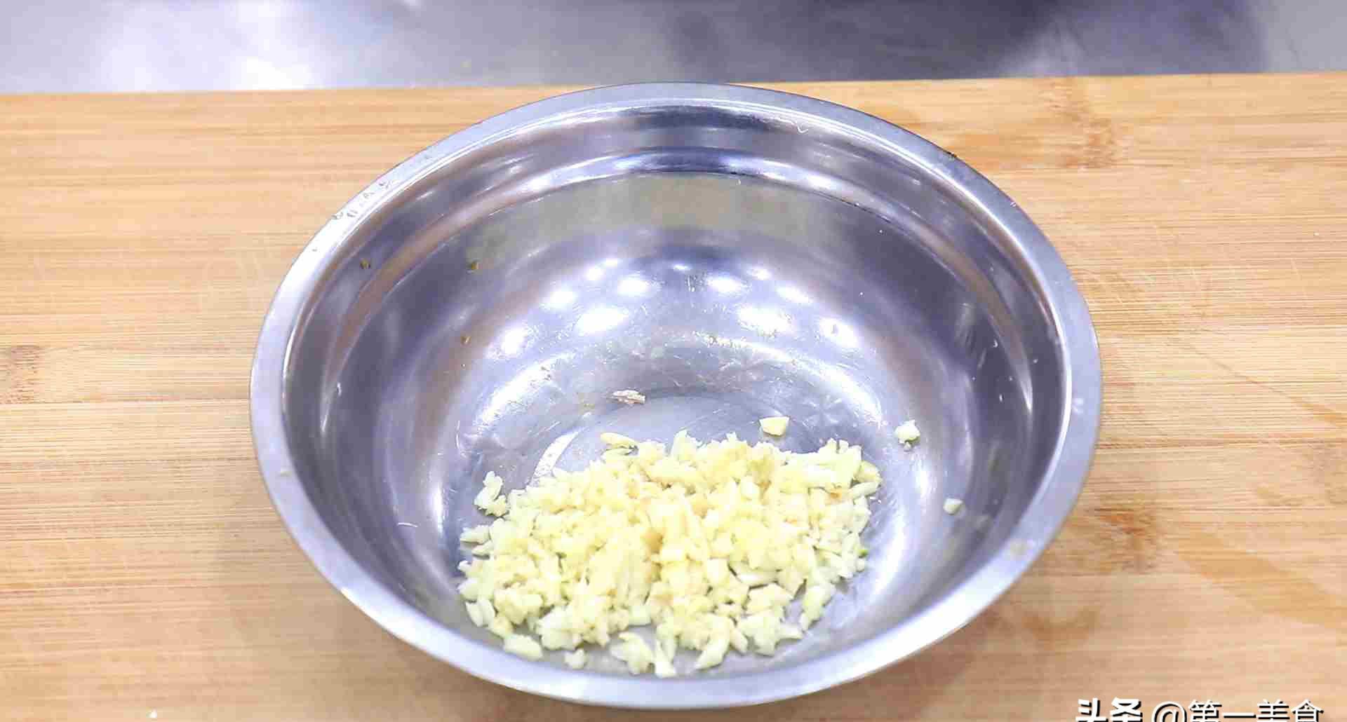 2.准备几粒大蒜,拍扁以后剁成蒜末放入碗中。