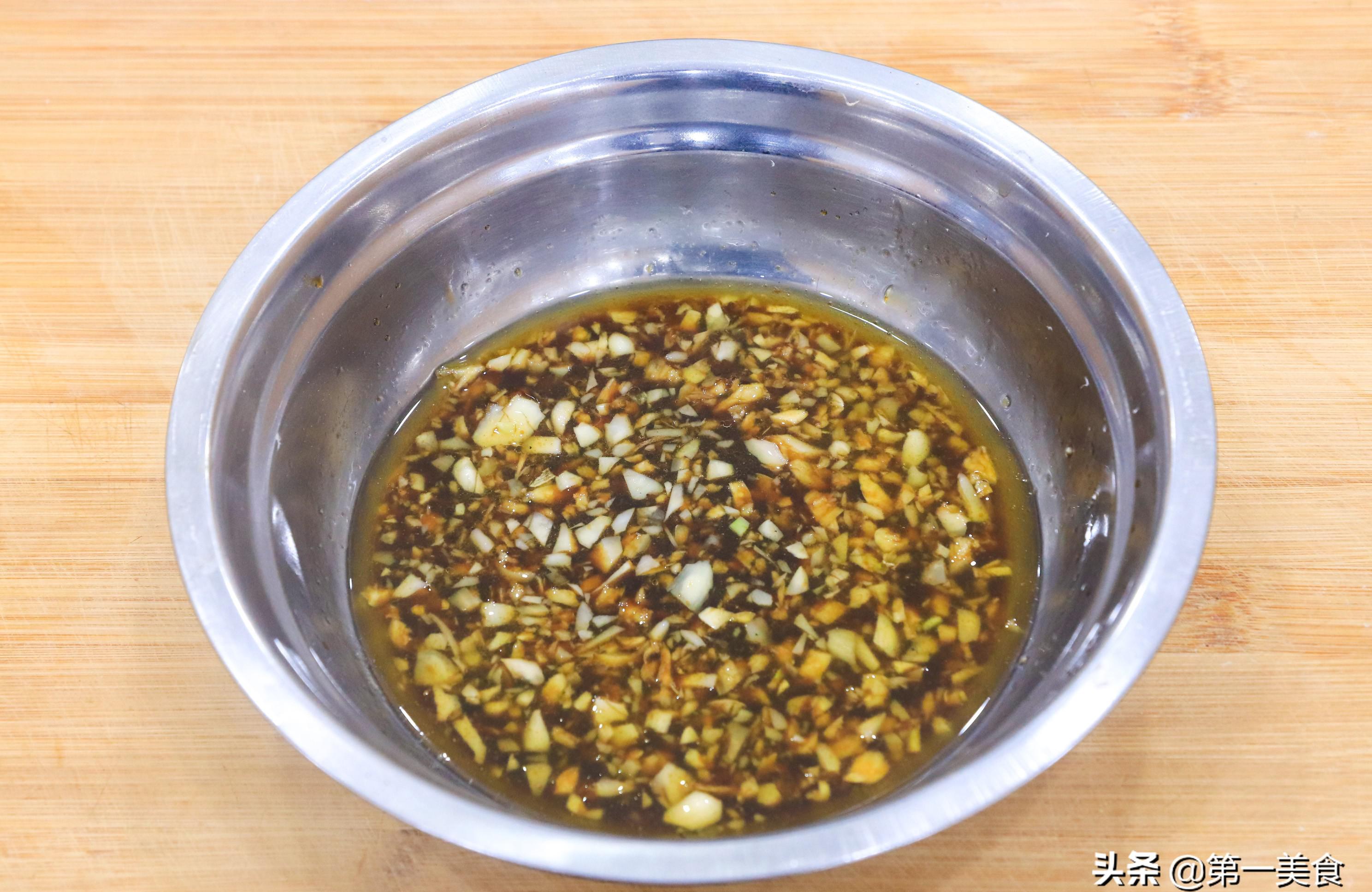锅内油量要适量增加,待油温升至七成热后离火,将滚烫的油淋在蒜末上,激发出浓郁的蒜香,接着放入2克食盐、10克生抽、10克香醋、5克白糖,迅速搅拌均匀,待其冷却后备用。