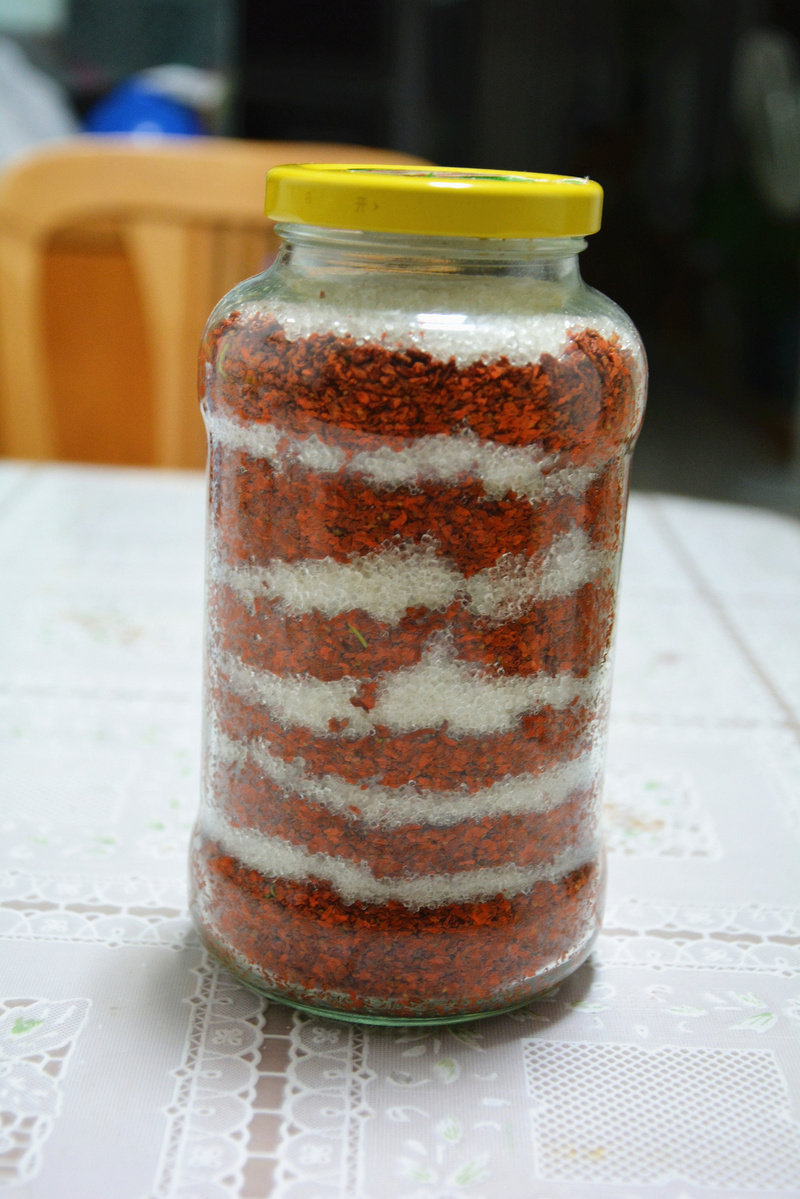 7:拿一个密封性好的玻璃瓶,一层桂花一层白砂糖的铺平,每层要压实,最后封层一定要多一点白糖,大功告成了。