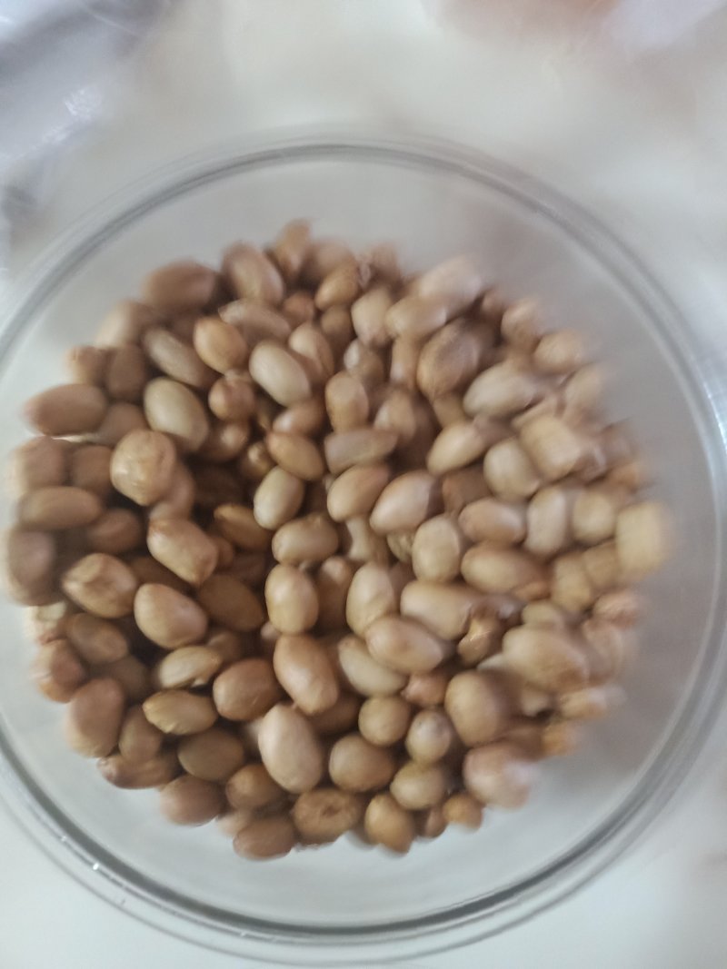 3:泡好后沥干水分,晾干表皮水分。找一个大点的平盘子,把花生米平铺在盘子里