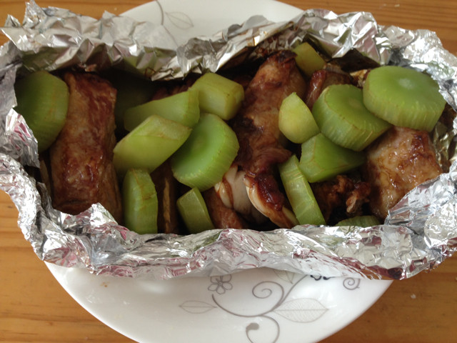 3:把锡纸四周捏起,然后把排骨和莴笋放入