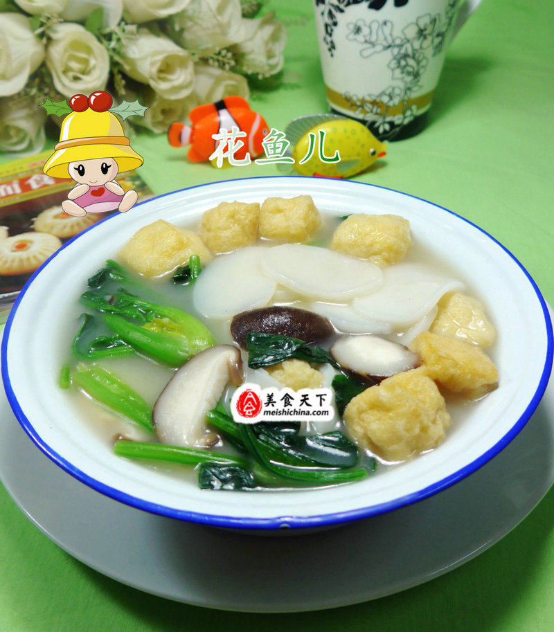 新鲜香菇35克;菠菜65克;小油豆腐35克;年糕片150克;