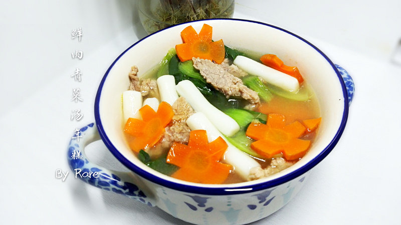 里脊肉100g;年糕260g;小青菜60g;胡萝卜30g;