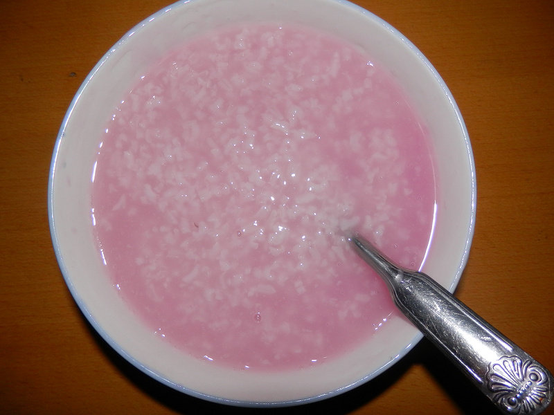 3:临出锅前加入糖滋柠檬汁,会发生神奇的变化,就成了粉红色的粥。