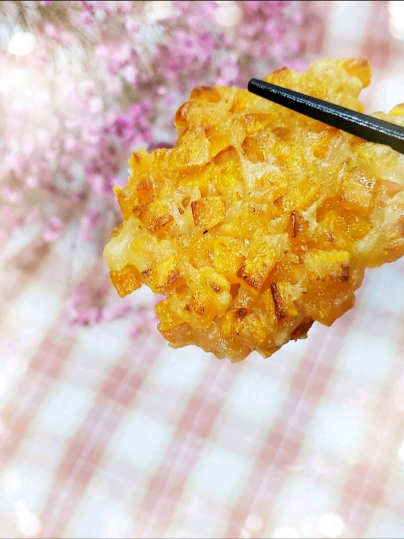 5:拌匀,让蜜薯丁能抱团,水量和面粉量边看边加,少了入锅会散,多了口感不好。