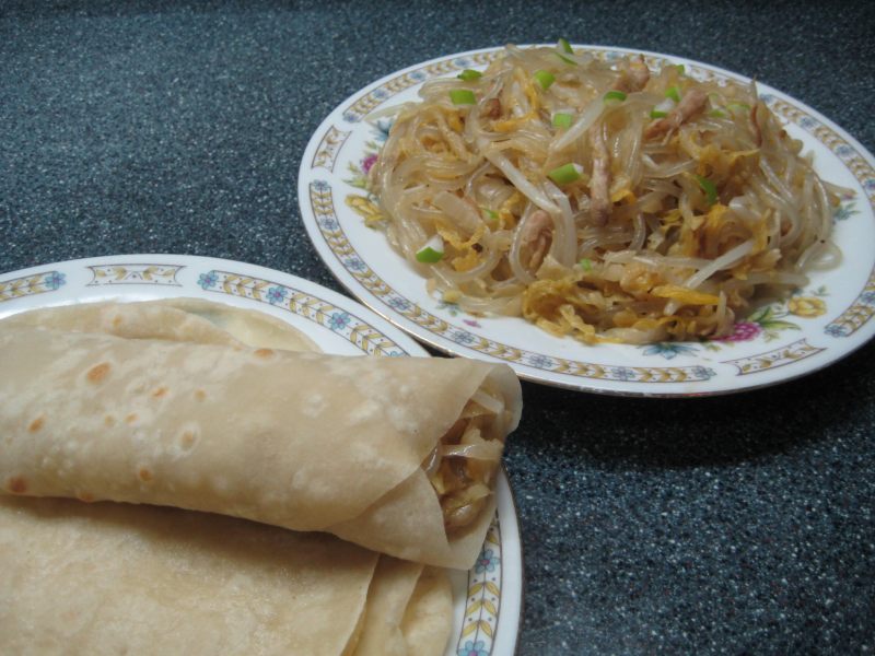 16:拿一个盘子,铺上春卷皮,再夹几筷子炒好的素菜铺在春卷皮上。