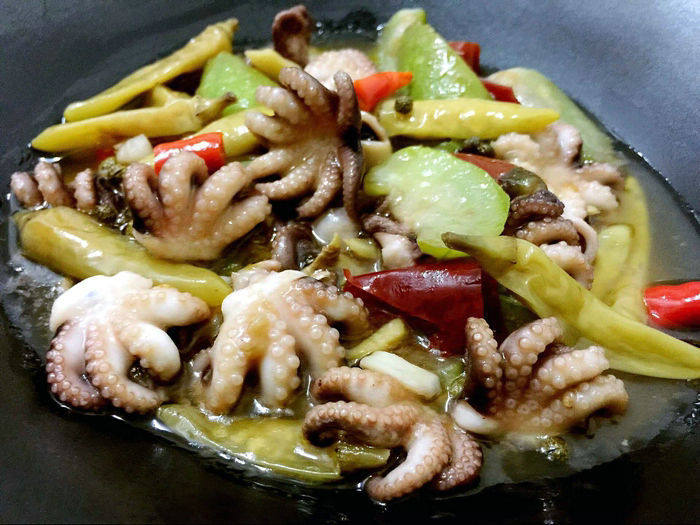 5:锅里热油爆香蒜姜,红辣椒,倒入章鱼翻炒。
