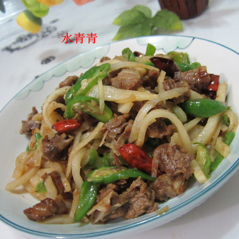2:备好的鸡切丁,凉薯去皮切丝,切点辣椒丝。