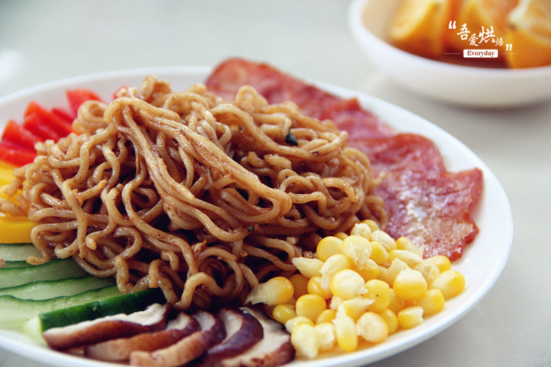 方便面1包(拌面);培根1片;香菇2个;红椒适量;黄椒适量;黄瓜适量;玉米粒适量;