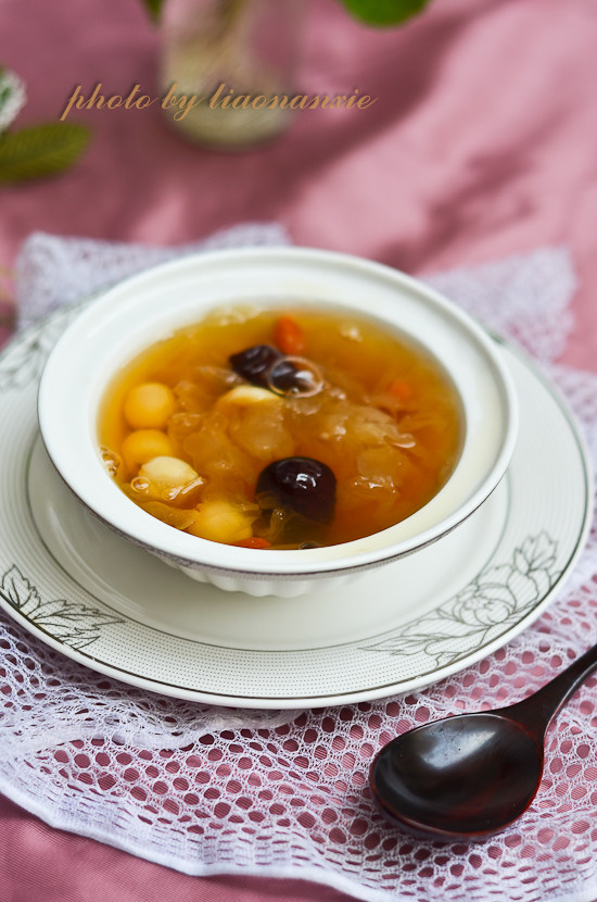 3:一小时后再放入大枣,再次煮一小时.冰糖和枸杞放入,焖一会儿即可.这样银耳的胶质都煮出来了,汤汁浓稠,放冰箱里冷藏口感更佳!