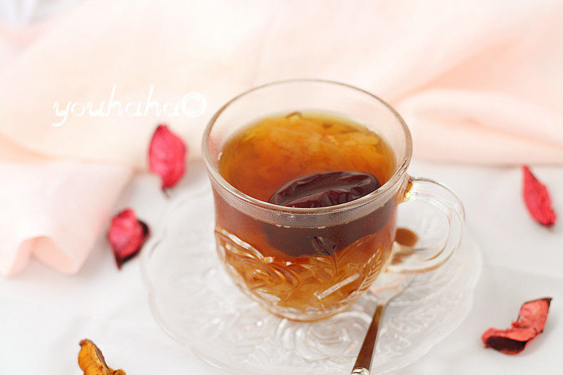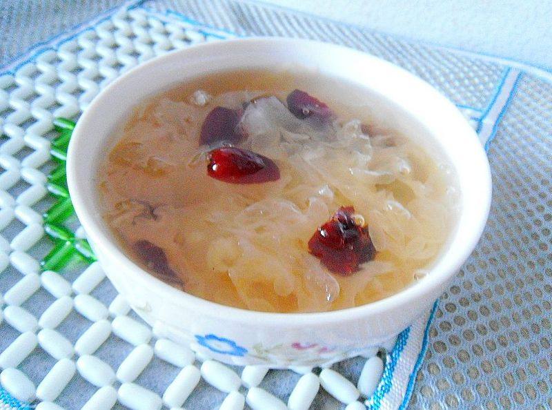 5:这时的银耳有点发黏的感觉,加入冰糖。放入适量的大枣,再蒸制40分钟。